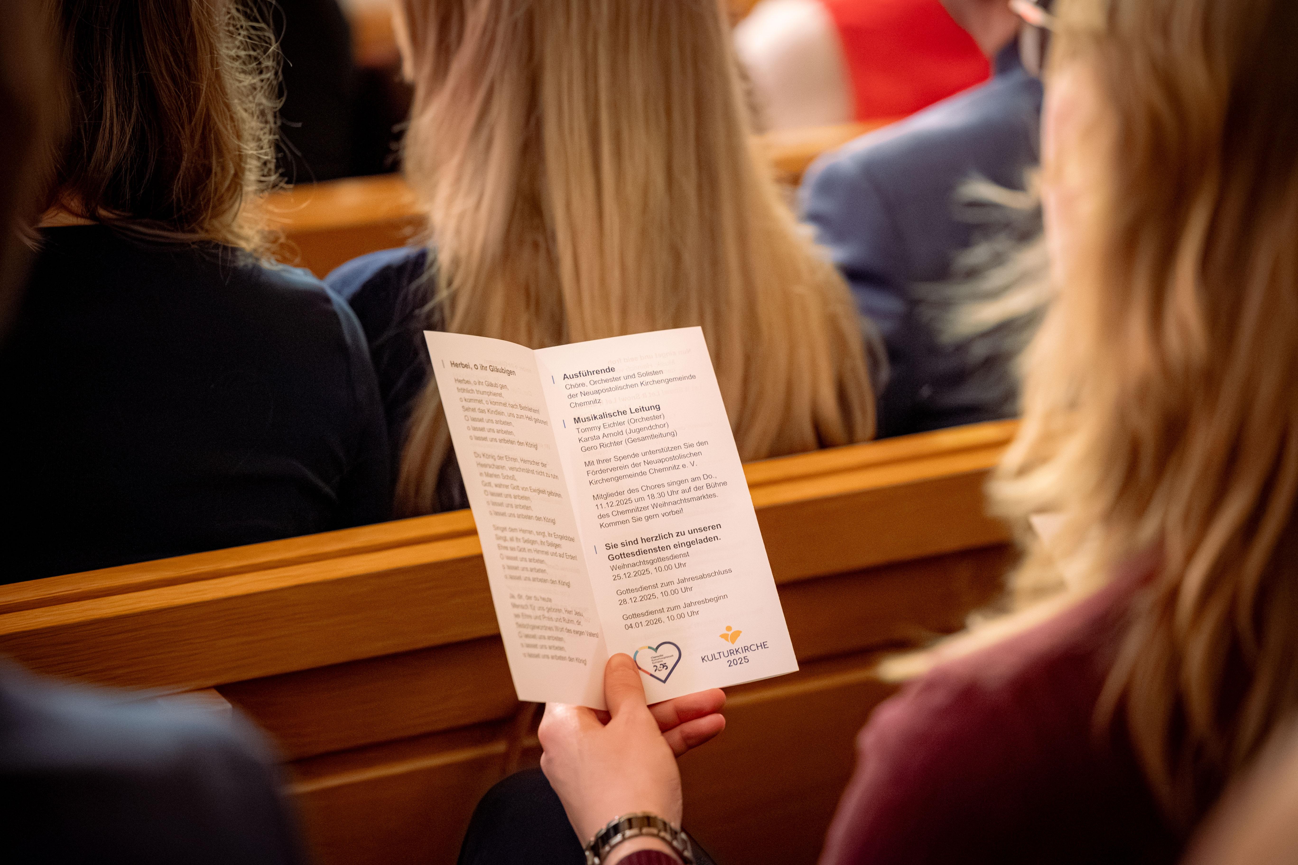 Einige Zeit später wurden die Eingangstüren der Kirche geöffnet und zahlreiche Gäste betraten den Saal, in welchem sie von einer wundervollen, weihnachtlichen Atmosphäre umhüllt wurden. An den Wänden ragten warm leuchtende, gelbe und rote Lichter nach oben und auch ein schneeweißer Weihnachtsstern leuchtete in der Mitte der Kirche.